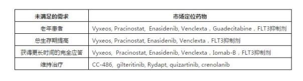 从目前研发进展看,近10年内还是会有不少药物可用于老年患者,Vyxeos(阿糖胞苷+柔红霉素)脂质体可提高耐受性,还有新靶点药物FLT3抑制剂(gilteritinib) 和IDH2抑制剂 (enasidenib)。