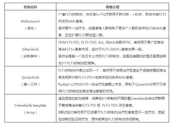 患者人群的扩展预示着有更多的市场机会,但是联合用药的成本是巨大的,财大气粗的诺华就将midostaurin定位为与3+7标准化疗联用,用于年轻成人,新诊断有FLT3-ITD突变的AML患者。而下一代FLT3抑制剂分别由第一三共,安斯泰来和Arog开发的quizartinib, gilteritinib和crenolanib,虽然进行了不少用于FLT3+各线治疗方案试验,但是首先还是希望通过单药用于难治复发FLT3+AML患者先上市。