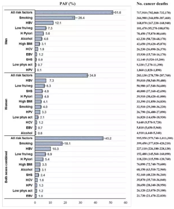 通过分析这些数据,研究人员发现,总体而言,共 995950(45.2%)例癌症患者死亡病例,其中包括 717910(52%)例男性病例以及 283130(35%)例女性病例,可以归因于上述七种因素。同时,952520(47%)的男性癌症新增病例以及 442650(28%)的女性新增病例也可以归因于上述七种因素。