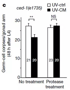 随后,科学家们又确认,CPR- 4 蛋白的确会在线虫受到辐射后,被分泌到培养基中。这和之前的实验结果一致。