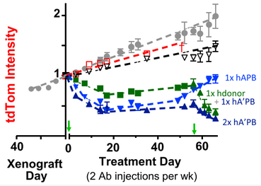 在体外实验中观察到了初步结果后,研究人员就开始了小鼠实验。他们通过尾部静脉注射的方式将人的肺癌细胞注射入小鼠体内,培养出横截面约 1cm2 大小的肿瘤,再将缺少 SIRPα的巨噬细胞注射给小鼠,和体外实验类似的,这些巨噬细胞只在肿瘤中积聚,而不会出现在其他的组织中。他们发现,有 30% 的健康小鼠的巨噬细胞能够吞噬肿瘤,而患癌小鼠自身的巨噬细胞只有 5% 不到,即使是敲低了 CD47 基因的肿瘤,也只能将它们自身巨噬细胞吞噬的比例提高到 12%。在 3 天的时间中,改造后的巨噬细胞让肿瘤减小了 25%!