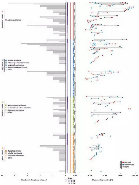 在早期癌症患者中,研究人员检测了 194 名乳腺癌 (n=45)、结直肠癌(n=42)、肺癌(n=65) 或卵巢癌 (n=42) 患者的血样。这些患者尚未接受治疗,其中大部分患者的肿瘤处于 I 期或 II 期。检测结果表明,采用 TEC-seq 技术,在晚期癌症患者中(III 或 IV 期), 超过 3 / 4 的患者被检测出致癌基因突变。而在早期癌症患者中(I 或 II 期)这个比率为 62%。