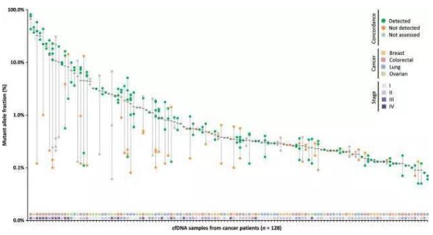 ▲乳腺癌、卵巢癌、肺癌、结直肠癌症患者的 ctDNA 检出情况(图片来源:参考资料[1])