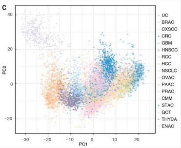 在过去的十几年里,科学家们做了大量的工作,建立了癌症基因组图谱(TCGA)、人类蛋白质图谱(HPA)等等,加速了我们对癌症的整体了解。在这次的研究开始前,研究人员首先从 TCGA 数据库中提取了 11000 名癌症患者中 9666 人的转录组和临床数据,共覆盖 33 个癌种。他们分析了这 33 种癌症中的所有蛋白质编码基因(19571 个)的表达水平,同时也分析了它们在 HPA 项目中 162 名健康志愿者的 37 种正常组织中的表达。