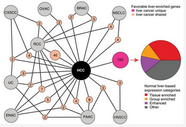 以肝癌为例,和其他癌症共享(浅橘色)或是独有的(玫粉色)不利预后的调控细胞代谢的基因