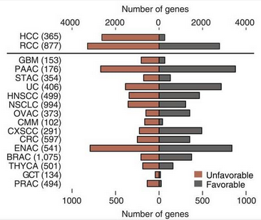 不同的癌症类型中,有利和不利的基因比例也不同。值得注意的是,有 2375 个基因在不同的癌症中对预后的作用是相反的,这也表明对预后基因表达的蛋白的功能研究是非常必要的。在这些预后基因中,只有少数已经在过去的研究中被证明有预测患者预后的价值,比如与结直肠癌生存率有关的 RBM3 基因 [3]。