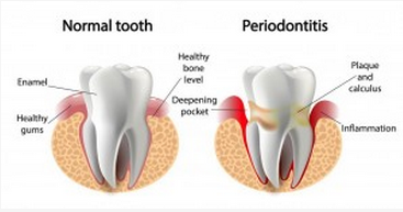 左侧为正常牙齿(健康的牙龈、牙骨质),右侧为牙周病的牙齿(牙龈发炎、牙菌斑、牙周袋)