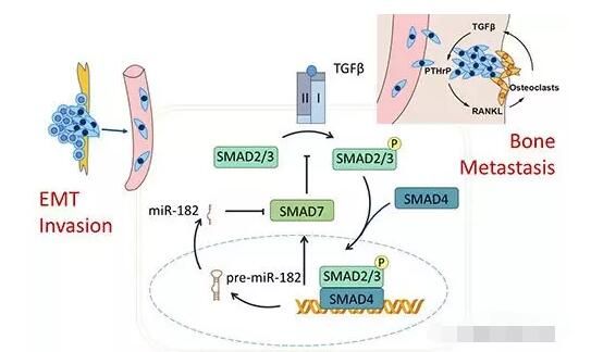 TGFβ可以促进肿瘤细胞miR-182的转录,而miR-182通过靶向抑制SMAD7的翻译阻断对TGFβ的负反馈调节,引起肿瘤细胞TGFβ的持续增强,促进TGFβ引起的癌细胞上皮-间充质转化及肿瘤侵袭,以及在骨...