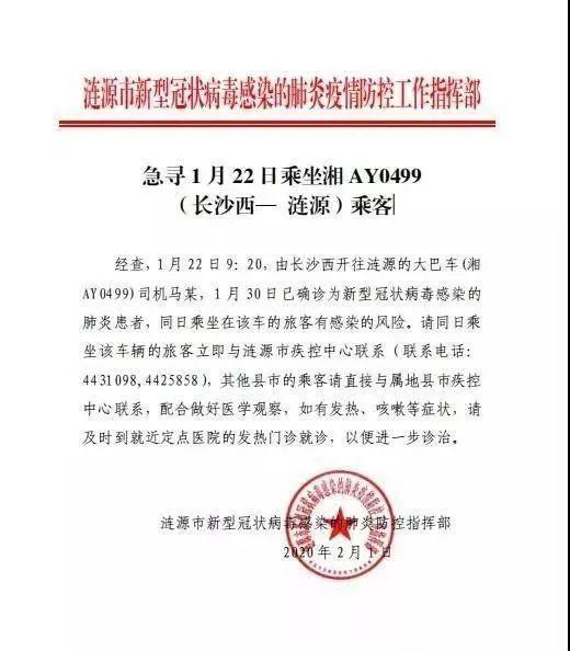 司机被确诊,急寻同车人1月18日、1月22日下午3时从长沙市黎托高速汽车站 运送旅客共计78人至益阳 。1月22日上午9:20从长沙西 送旅客至涟源 。湖南疾控紧急提醒以下车次乘客&d