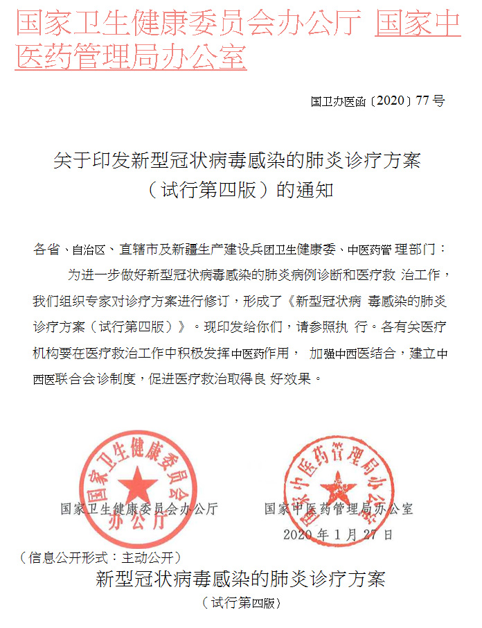 关于印发新型冠状病毒感染的肺炎诊疗方案(试行第四版)的通知