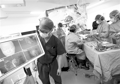 4月8日,上海市浦南医院医生使用3D神经导航仪器,为来自江苏的一名女性患者成功进行了颅内肿瘤切除手术,正在上海举行的“颅底及脑...