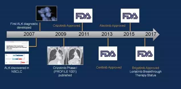 新的治疗方法已经进入了飞速发展的时代,也就是近8年时间,连续有四个药物通过了适应症的审批。继一代的克唑替尼之后,二代治疗药物Alectinib、Brigatinib、Ceritinib,都纷纷获得了FDA的审批应用于临床。
