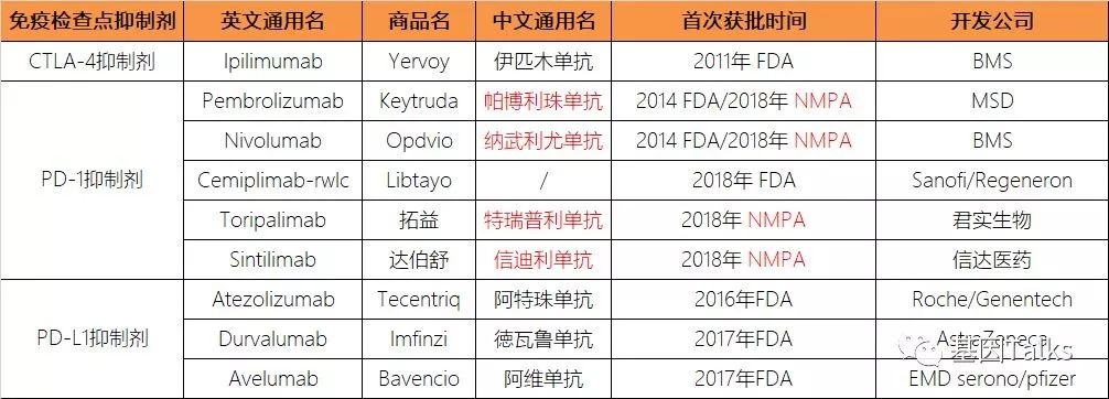 ▲ 免疫检查点抑制剂主要包括CTLA-4抑制剂与PD-(L)1抑制剂,目前FDA及NMPA一共批准9款ICIs上市