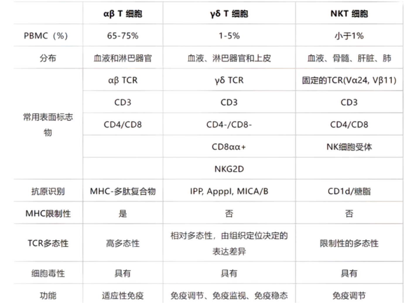 3. 三种T细胞的异同 PS:NKT血液中含量少,表面标志物中有NK细胞受体,和γδT一样没有MHC限制,具有细胞毒性,但是功能主要是免疫调节。