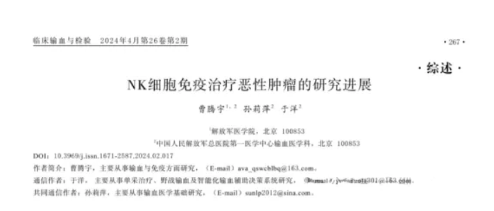 2024 年 4 月,中国人民解放军医学院及其总医院第一医学中心的研究团队在权威行业期刊《临床输血与检验》的第 26 卷第 2 期中,发表了题为《NK 细胞免疫治疗恶性肿瘤的研究进展》的综述性报告。该报告深入探讨了 NK 细胞在恶性肿瘤免疫治疗领域的最新研究进展及其应用前景。该综述报告结合了国内外近年来的最新研究成果,全面阐述了 NK 细胞的杀瘤机制、活性调节策略,并深入探讨了 NK 细胞在临床试验中的应用进展,以及 NK 细胞来源与扩增方法的研究现状。报告旨在为 NK 细胞在恶性肿瘤治疗中的进一步应用,以及 NK 细胞体外扩增体系的建立和优化,提供具有参考价值的洞见与指导。
