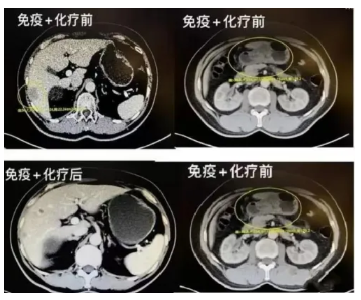 治疗效果十分显著,通过查 CT 提示:1、胃窦部肿物较前缩小,胃周围多发小淋巴结较前缩小、减少。2、肝脏多发转移瘤较前缩小。在细胞免疫 + 化疗的治疗后,肿瘤和转移灶均较前退缩。