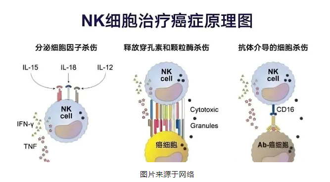 NK 免疫细胞具有抵抗外来细菌和病毒的作用。在病毒感染时,不需要抗原刺激,就可以产生细胞因子,例如白细胞介素、干扰素等因子,对肿瘤的发生和感染起到一定的杀伤作用。