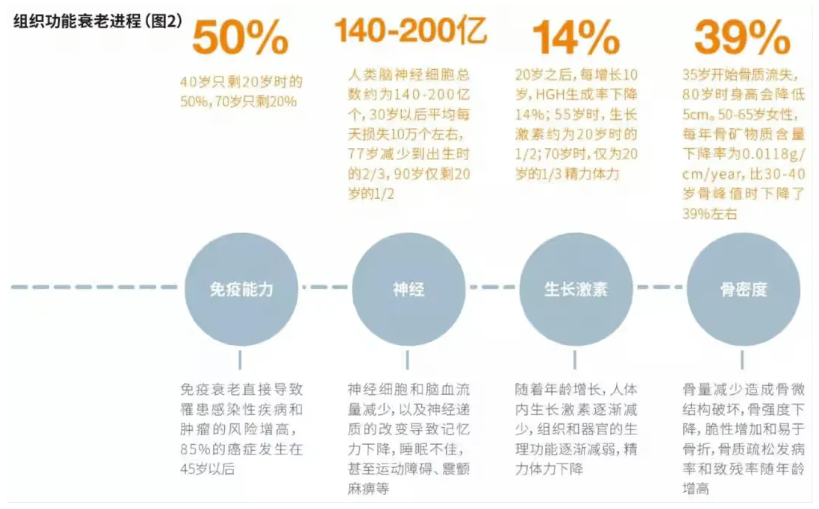 以女性为例,身体器官衰老年龄和组织功能衰老进程: