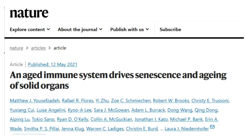 2021 年 5 月 12 日,美国明尼苏达大学医学院的研究人员在《Nature》发表研究论文指出,衰老细胞是机体衰老的关键因素,其中免疫细胞的衰老尤为重要,衰老的免疫细胞会加速其他器官衰老,从而推动全身性衰老。