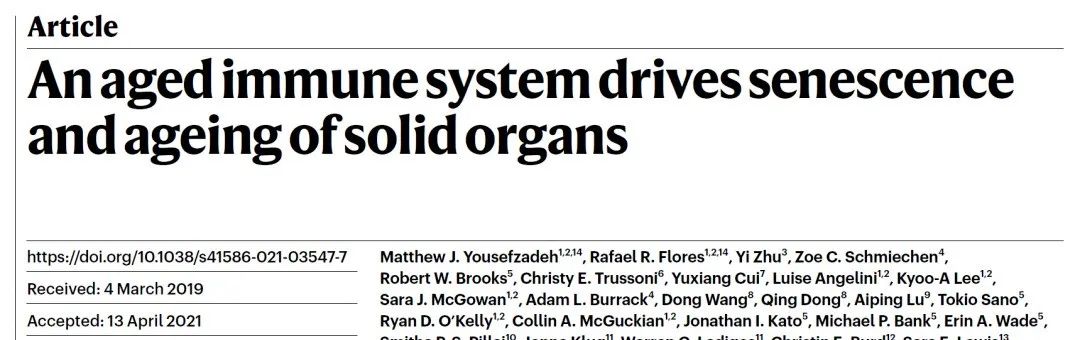 2021 年 5 月,美国明尼苏达大学的研究人员在国际顶尖学术期刊《Nature》上公布了一项重磅成果:免疫系统的衰老会致使实体器官衰老。