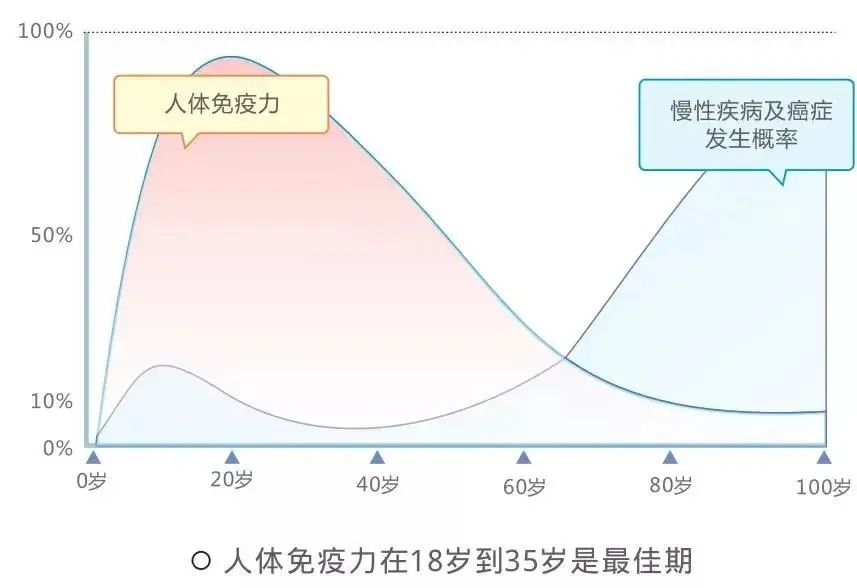 因此,T 细胞的数量、功能及多样性对于抵御癌症至关重要。25 岁之后,随着年龄的增加,T 细胞的多样性随之下降。40 岁后,更是呈现断崖式下降,所以我们应该在这个关键年龄段未雨绸缪地进行先期准备。