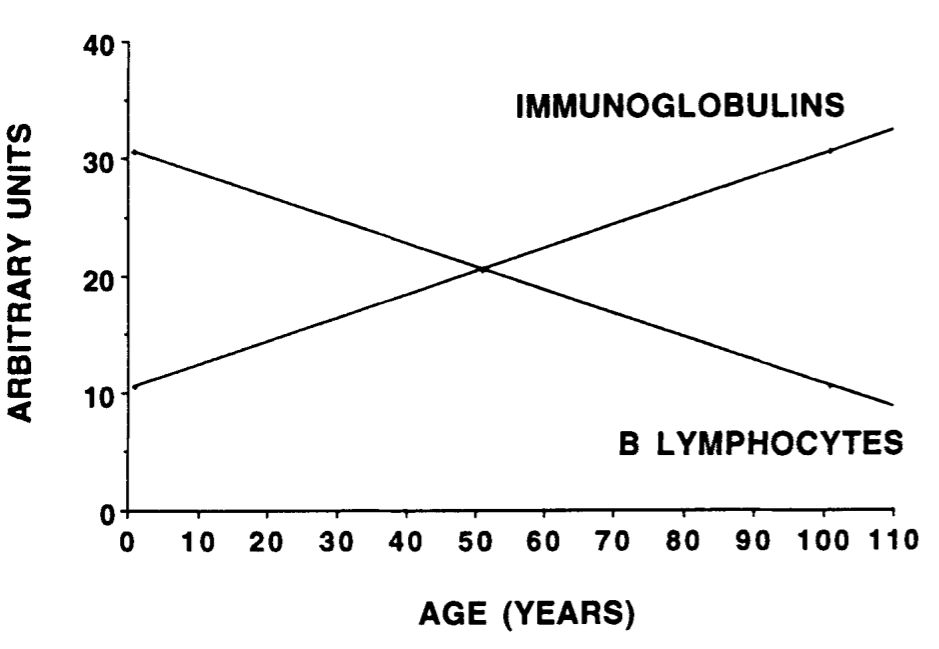1962 年,Walford 提出免疫衰老学说,认为免疫功能的衰退是造成机体衰老的重要因素。随着年龄的增长,免疫器官老化、免疫细胞及细胞因子降低,机体的免疫功能逐渐减弱,感染性疾病、肿瘤的发病率和死亡率也逐渐增高。