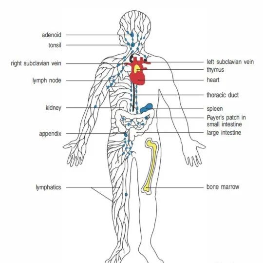 淋巴器官:包含中枢淋巴器官(胸腺和骨髓)以及外周淋巴器官(淋巴结、脾和扁桃体)。