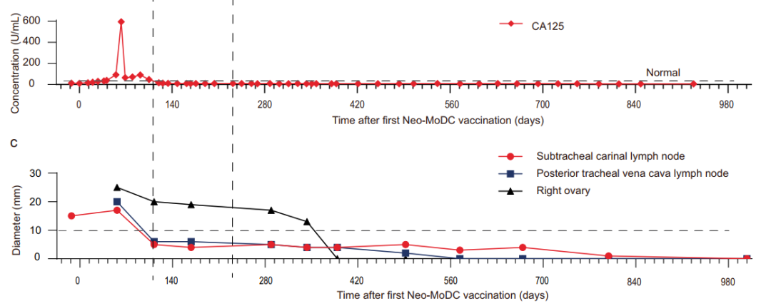 接受Neo-MoDC疫苗和nivolumab联合治疗后肿瘤肿瘤标志物CA125和肿瘤病灶大小变化