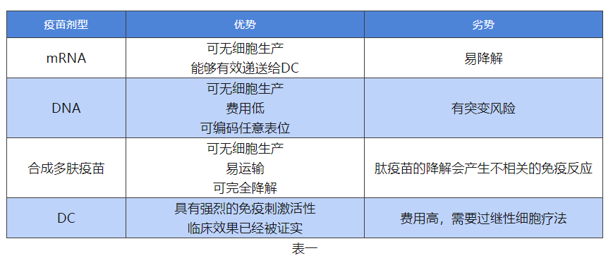肿瘤新抗原疫苗的开发策略已相对清晰。首先,从患者身上获取肿瘤组织和正常组织样本,然后通过比较这两组样本的外显子测序结果,确定肿瘤中的突变基因。使用 cDNA 微阵列或 RNA 测序进行测试,根据基因表达水平选择合适的突变新抗原。通过计算机分析预测候选抗原与 HLA 的粘附亲和力,并筛选出最有可能成为肿瘤新抗原的基因序列。最后,将这些突变基因设计成疫苗。肿瘤疫苗可以采用多种形式,如肽疫苗、树突状细胞疫苗、mRNA 疫苗、DNA 疫苗和病毒疫苗。不同形式的疫苗具有各自的优缺点(详见表 1)。