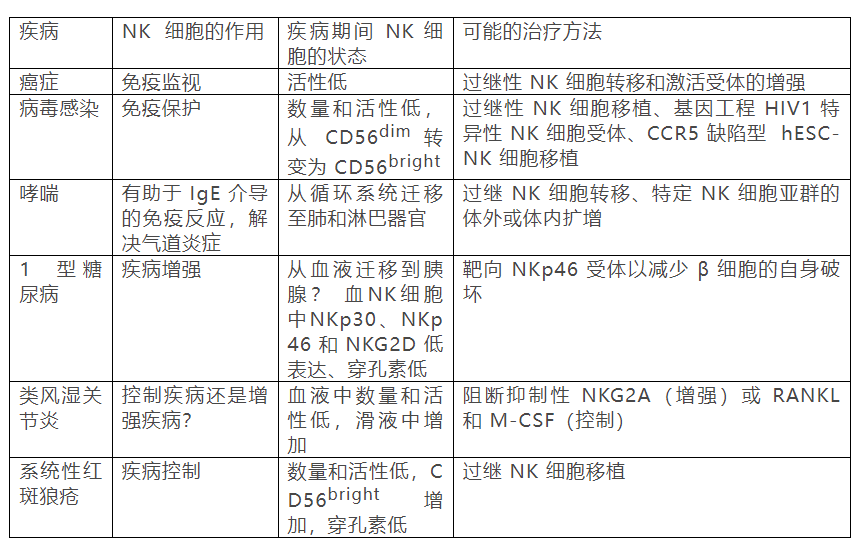 总之,NK 细胞在控制病毒感染、癌症和自身免疫性疾病方面发挥着重要作用。研究表明,NK 细胞的数量和细胞毒功能在多种疾病中都会降低,因此外源性引入制备的 NK 细胞有潜力用于治疗这些疾病。虽然 NK 细胞会加重某些自身免疫性疾病,如 1 型糖尿病,但可以通过施用抗体来加以预防。未来,随着对 NK 细胞在不同疾病中的研究不断深入,其将在人类健康管理中发挥更大的作用。