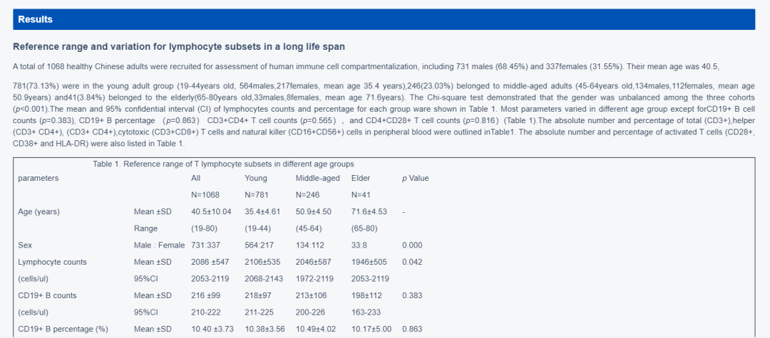 北京协和医院的研究人员曾在行业专业期刊《Aging》上发表研究报告《Aging of immune system: Immune signature from peripheral blood lymphocyte subsets in 1068 healthy adults》,分析了 1068 名健康人外周血淋巴细胞及其亚群随年龄变化在数量和比例上发生的改变。