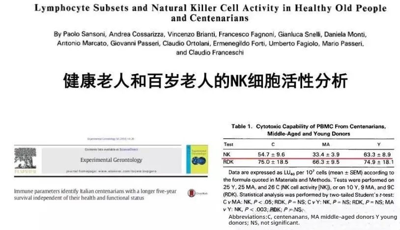 一篇发表在专业期刊《Experimental Gerontology》上的文章《Lymphocyte Subsets and Natural Killer Cell Activity in Healthy Old People and Centenarians》(健康老人和百岁老人的 NK 细胞活性分析),科学家观察了 138 名 4 - 106 岁的健康人,其中包含 26 名百岁老人。研究发现,作为先天性免疫细胞的自然杀伤细胞 ——NK 细胞不仅能抗癌还能抗衰老。