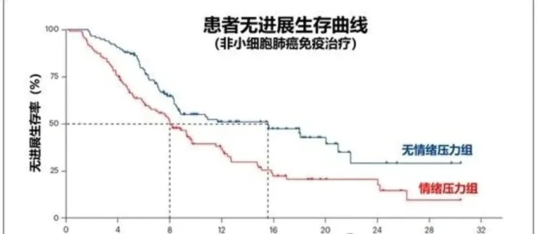 通过心理测试量表,他们把 200 多位准备接受免疫治疗的非小细胞肺癌患者分为两组,一半有焦虑或抑郁,另一半则没有心理问题。结果非常令人震惊:治疗前就有情绪压力的患者,生活质量更差,治疗效果更差,而且存活时间也更短!