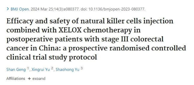 2024 年 3 月 25 日,我国的研究人员在行业期刊《BMJ Open》上发表了有关自然杀伤细胞注射联合化疗对中国 Ⅲ 期