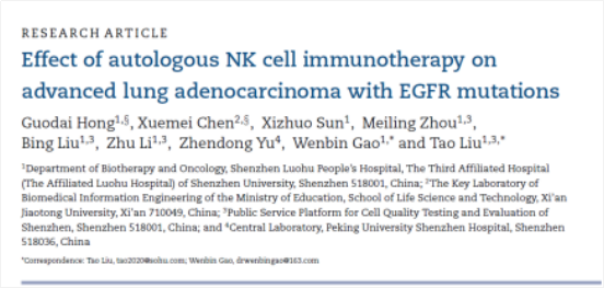 [4]Guodai H, Xuemei C, et al. Effect of autologous NK cell immunotherapy on Precision advanced lung adenocarcinoma with EGFR mutations[J]. Clinical Medicine, 2(4), 2019, 235–245 doi: 10.1093/pcmedi/pbz023.