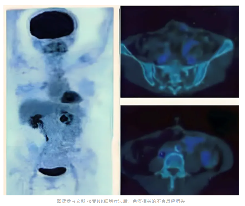 例如,一位 64 岁的印度尼西亚女性横结肠癌患者,长期遭受肠梗阻和血性腹泻困扰。接受 NK 细胞疗法治疗后,经过两个周期的治疗,再次进行 PET 扫描随访时,病灶区域免疫相关的不良反应消失 了。不仅如此,患者日常生活也恢复正常,且目前仍未出现局部复发的迹象和症状。