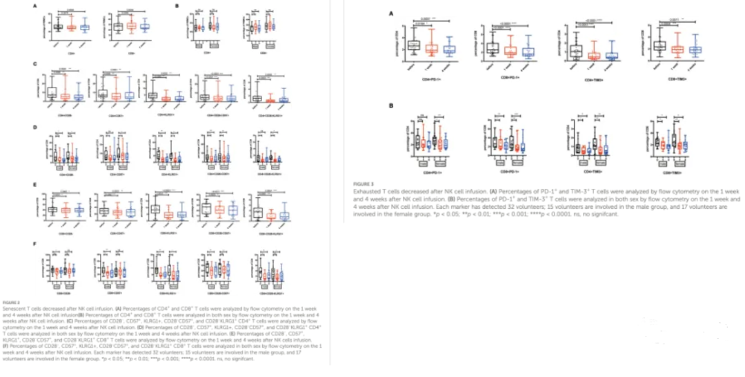 该研究结果显示:在回输 NK 细胞后 1 周和 4 周,衰老的 CD4 + 和 CD8+T 细胞显著减少(Fig2C,2E);衰竭状态的 T 细胞(CD4+/CD8+ PD - 1+、CD4+/CD8+TIM - 3+)显著减少(Fig3A)。