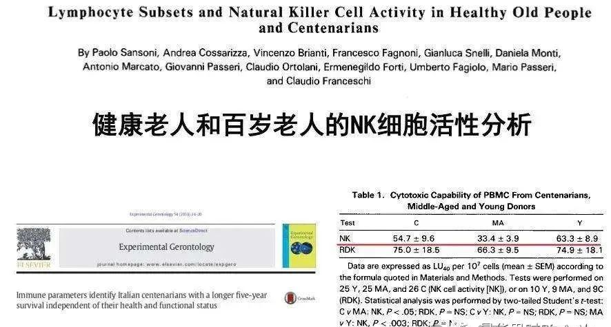 图:研究人员观察了138名4-106岁的健康人其中,包含26名百岁老人。研究发现,作为先天性免疫细胞的自然杀伤细胞(Natural Killer cell)——NK细胞不仅能抗癌还能抗衰老。