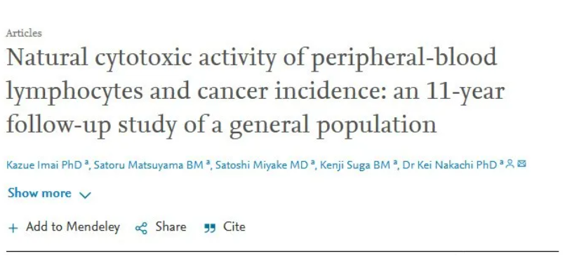 日本埼玉市埼玉癌症中心研究所团队曾在全球著名学术期刊 Science direct 发表一项研究称,外周血 NK 细胞活性与肿瘤的发生率明显相关,NK 细胞活性越低,肿瘤的发生率越高。对日本中年及老年人随访 11 年后发现,NK 细胞的活性和功能与肿瘤组织的大小、转移以及不良预后息息相关。