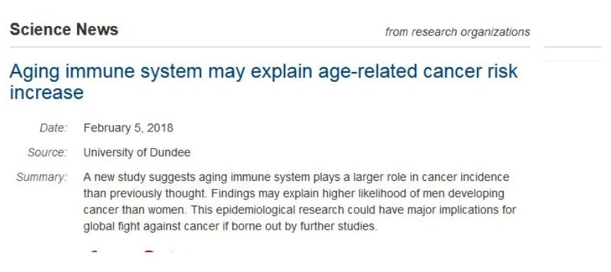 此外,邓迪大学的 Thea Newman 教授课题组和赫瑞・瓦特大学、爱丁堡大学、法国 Curie 学院的科学家们也发现癌症发病率与衰退的免疫系统有很大关系。