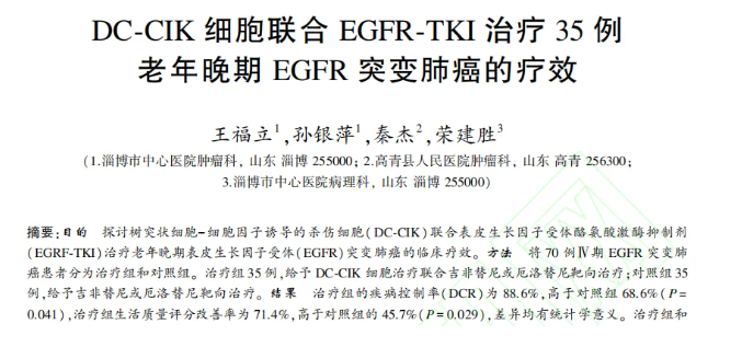 DC - CIK 细胞联合 EGFR - TKI 治疗 35 例老年晚期 EGFR 突变肺癌的疗效将 70 例 Ⅳ 期 EGFR 突变肺癌患者分为治疗组和对照组。治疗组 35 例,给予 DC - CIK 细胞治疗联合吉非替尼或厄洛替尼靶向治疗;对照组 35 例,给予吉非替尼或厄洛替尼靶向治疗。结果显示:治疗组的疾病控制率为 88.6%,高于对照组的 68.6%,治疗组生活质量评分改善率为 71.4%,高于对照组 45.7%。由此说明,DC - CIK 细胞联合 EGFR - TKI 可以提高晚期老年 EGFR 突变肺癌患者的疾病空置率和生活质量,延长患者的无进展生存期。