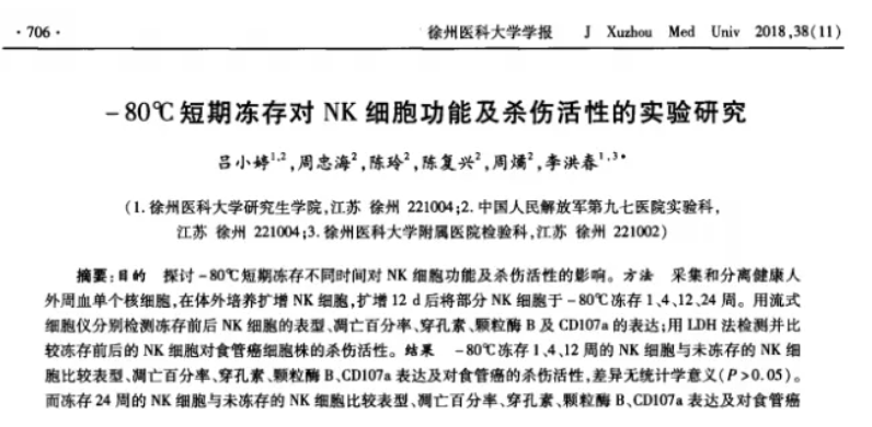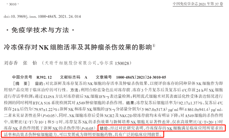 免疫治疗 复苏活力依旧强劲!冷冻保存的 NK 细胞可达临床要求 2024-10-29 14:28:03 免疫系统中的勇士 —— 自然杀伤(NK)细胞,始终在我们体内与肿瘤等疾病英勇搏斗。有时,我们会选择将这些精英战士进行 “冷冻”,以便为未来做好准备。然而,冷冻后的 NK 细胞与新鲜的它们相比,战斗力是否会有所降低呢? 《中国免疫学杂志》上一篇关于冷冻保存对 NK 细胞活率及其肿瘤杀伤效果的影响研究文章为我们提供了答案。 一、复苏后活力依旧 研究发现,即便经过长时间冷冻,NK 细胞复苏后的活力仍能达到约 92%,即便复苏 24 小时后,其活力依旧可达到 80%。这表明,它们依然拥有良好的战斗能力。 二、关键能力保留 NK 细胞能够分泌一种名为 IFN - γ 的物质,该物质对击败肿瘤有着重要助力。冷冻后,这一能力虽有所下降,但差异并不显著。 三、击败肿瘤杀伤力不减 对于新鲜和冷冻的 NK 细胞的肿瘤杀伤效果,实验结果令人欣喜。无论是在不同的靶点对比下,还是在不同的冷冻时间内,它们对癌细胞的杀伤效果几乎毫无差异。 四、抗肿瘤:-80℃下冻存效果不减 为了满足肿瘤患者的需求,有时需要在 -80℃下对 NK 细胞进行冻存。研究人员发现,在这种情况下,12 周内的 NK 细胞与未冻存的 NK 细胞相比,在表型和活性方面几乎没有变化。 结论:经过对比研究表明,冷冻保存的 NK 细胞满足临床应用所要求的活率和高效杀伤肿瘤细胞能力,能够发展成为即用型细胞药物,具有广泛的临床应用前景。 值得一提的是,随着年龄的增长,NK 细胞的活力会逐年下降。在年轻健康之时,选择合适的时机进行 NK 细胞存储,待未来有需要的时候,这支提前存储的 “细胞精英部队” 可以帮助我们提升免疫力、进行机体保养、对抗疾病等,为肿瘤患者争取更多免疫治疗以及提高生存期的机会。 不论是新鲜的还是 “存储” 后的 NK 细胞,都是我们身体的勇敢战士。以上研究证实,即便经过冷冻保存,它们的战斗力也几乎未曾减弱。对于众多患者而言,这一发现或许是一条全新的治疗途径,也是一个充满希望的未来。 标签: 返回列表 NK 细胞冻存:开启免疫细胞保存与应用的新契机