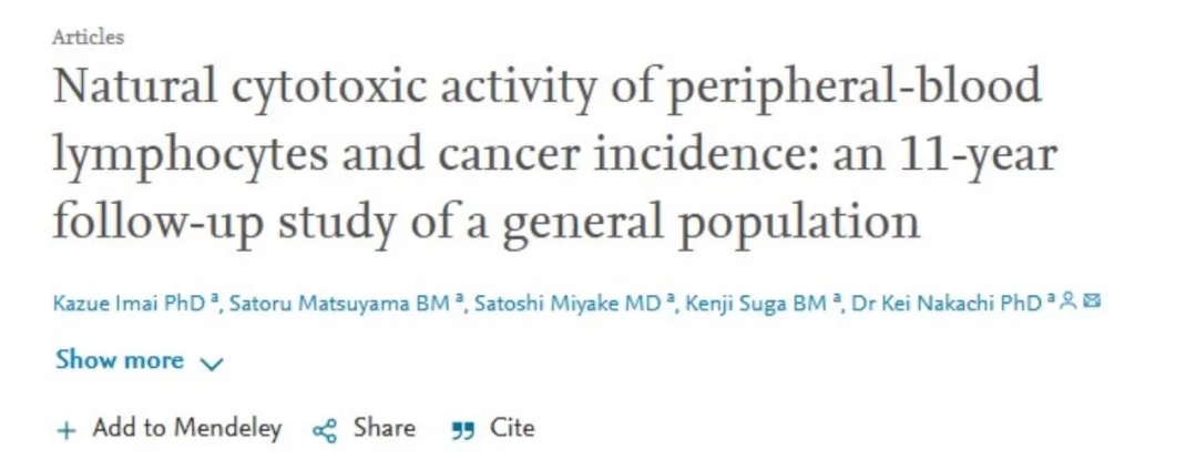 日本埼玉市埼玉癌症中心研究所团队曾在全球著名学术期刊《Science direct》上发表了一项研究成果:外周血 NK 细胞活性与肿瘤的发生率存在着显著的相关性,NK 细胞活性越低,肿瘤的发生率就越高。在对日本中年及老年人进行长达 11 年的随访后发现,NK 细胞的活性与功能和肿瘤组织的大小、转移情况以及不良预后有着极为密切的关系。