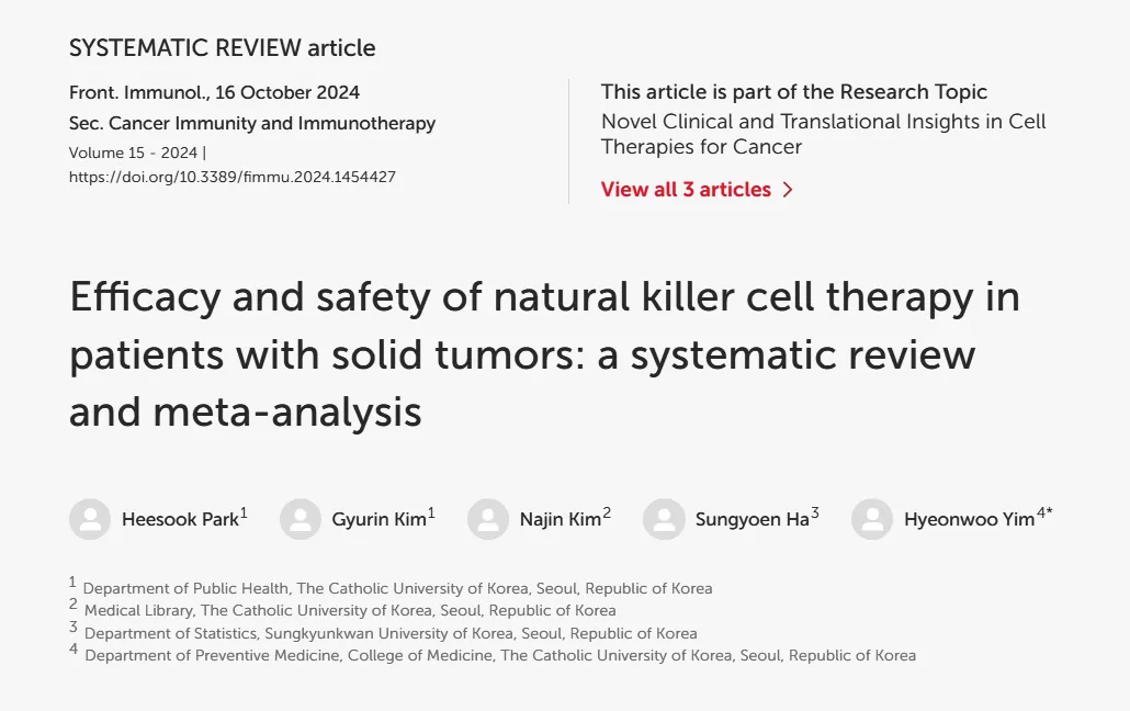 2024 年 10 月 16 日,韩国首尔天主教大学在行业权威期刊《Front Immunol》上重磅发表了一篇题为《Efficacy and safety of natural killer cell therapy in patients with solid tumors: a systematic review and meta-analysis》的综述报告,为 NK 细胞疗法在实体瘤治疗领域的应用提供了强有力的理论支撑。