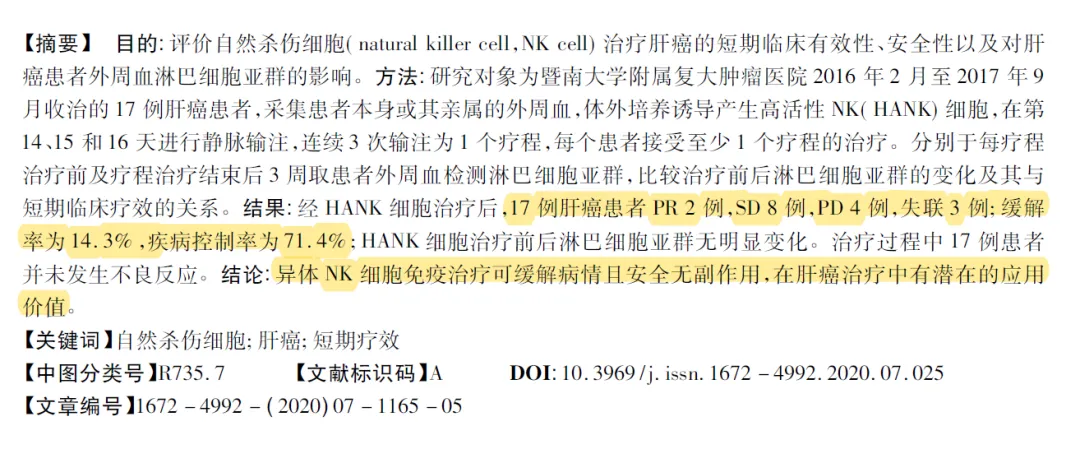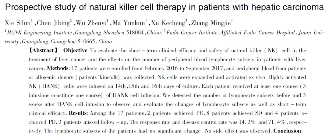 他们精心挑选了 2016 年 2 月至 2017 年 9 月收治的 17 例肝癌患者,为这些患者量身定制了 NK 细胞免疫治疗方案,即将在体外精心增殖的高活性 NK 细胞精准注入患者体内,并对患者病情展开了如鹰眼般敏锐的追踪观察与精细检测。