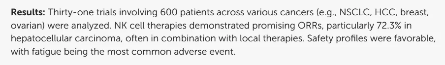 这份报告犹如一位严谨的 “评审官”,系统且全面地评价和荟萃分析了自然杀伤细胞(NK)疗法针对实体瘤患者的疗效与安全性。研究团队精心剖析了 31 项涉及 600 名罹患不同癌症患者的试验,这些患者涵盖了肺癌(NSCLC)、肝细胞癌(HCC)、乳腺癌、卵巢癌等多个癌种。令人振奋的是,NK 细胞疗法在实战中展现出了良好的 ORR(客观缓解率),尤其是在肝细胞癌的治疗上,其 ORR 更是高达 72.3%,这一惊艳的数据无疑为肝癌患者带来了新的曙光,让人们真切看到了 NK 细胞疗法攻克实体瘤的强大潜力。