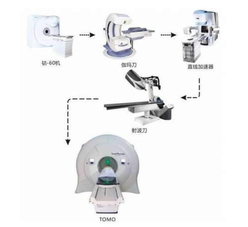 外照射:X射线治疗机,是放疗的原始治疗技术,目前仍在少量范围地用来治疗。钴和铯放射治疗机是放射性核素在衰变过程中产生的射线,用来治疗肿瘤。直线加速器,产生高能X射线和电子射线可供选择治疗不同肿瘤。快中子射线,负介子和质子加速器,在治疗技术和生物效应上更有特殊性。近距离治疗:把可以产生射线的放射性核素,采用不同途径来尽可能接近肿瘤,来提高肿瘤剂量。立体定向放射:γ—刀、X—刀通过计算机定治疗计划和控制多向旋转性放射提高治疗区剂量。