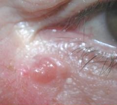 基底细胞瘤(basal cell carcinoma)亦称蚕蚀性溃疡,是皮肤癌肿最多见的一种,发病率很高,占眼睑恶性肿瘤的第一位(约50%以上),男性比女性稍多,老年人比青年人多见,年龄高峰在50~60岁之间,一般仅在局部呈浸润性生长,很少发生转移,但处理不当,或不加处理,也可能严重破坏眼部组织,甚至侵入副鼻窦及颅内而引起死亡。本病发生虽无明显原因,但与几个因素有关,好发于头皮,面部等暴露部位以及多见于户外工作和浅色皮肤者,与长期日光曝晒有关。长期摄入无机砷或含砷较高的饮水,食物等亦可发生此肿瘤。