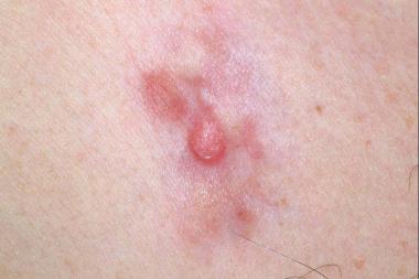 隆突性皮肤纤维肉瘤(Dermatofibrosarcoma protuberans)系源于成纤维细胞或组织细胞,起源于真皮缓慢生长的肿瘤,以后在斑块上发生多数结节,本病呈局部侵袭,偶有广泛播散,但罕见转移。患者通常为中年人,本瘤可发生于身体任何部位,但多发于躯干及四肢,特别是近侧部,其分布在腹侧多于背侧,近心端多于远心端,少见于头面部及颈区及面部。